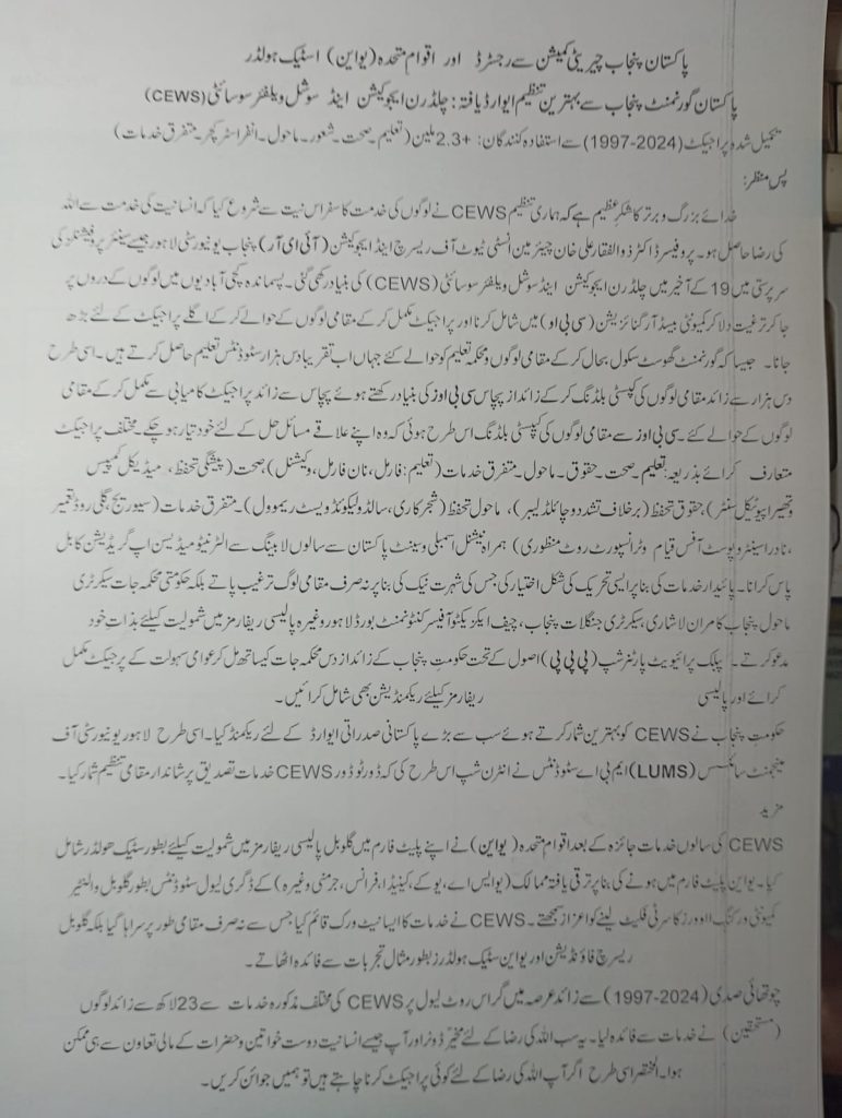 That’s why the CEWS was rated BEST-NGO by the Government of Punjab Pakistan as well recommended for the biggest award of Pakistan i.e. President Civil Award of Pakistan”. Thus, the CEWS progressed from being a community based to a global level organization.